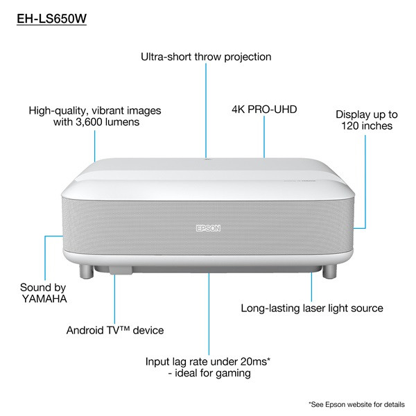| Fokozza az otthoni szórakozás élményét az Epson 4K PRO-UHD1 ultra rövid vetítési távolságú lézerprojektorával. Stílusos kialakításának köszönhetően tökéletesen illeszkedik az otthonába, és az Android TV funkciónak, valamint a YAMAHA hangzásvilágnak köszönhetően valósággal elmerülhet a kedvenc műsoraiban. A 60" méretű képhez elég mindössze 3,2 cm távolság a faltól, és a képméret a tökéletes házimozi-élmény jegyében akár 120"-ig is növelhető. |