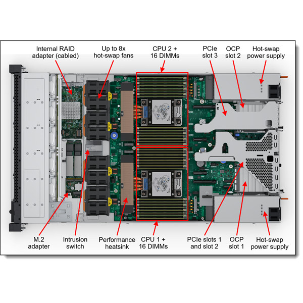 Lenovo ThinkSystem SR630 V4, 1x Intel Xeon 6520P 24C 210W 2.4GHz Processor, 1x 32GB TruDDR5 6400MHz (2Rx8) RDIMM, Drive bays: Open bay / 8x2.5" SAS/SATA Backplane, RAID 940-8i 4GB Flash PCIe Gen4 12Gb Adapter, Broadcom 5719 1GbE RJ45 4-port OCP Ethernet Adapter, 2x 1300W 230V/115V Titanium CRPS Premium Hot-Swap Power Supply, ThinkSystem SR630 V4 x8/x8 PCIe Gen5 Riser 1, Standard Fan Module, ThinkSystem Toolless Slide Rail Kit V4 with 1U CMA, 1U Security Bezel, XClarity XCC3 premier - FOD, 3 yr NBD warranty
