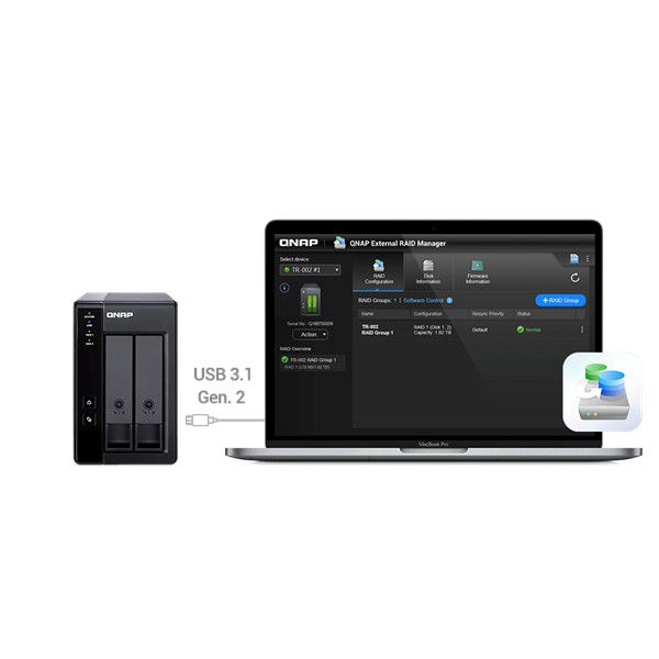 QNAP NAS 2 fiókos RAID bővítőegység, NAS-hoz és PC-hez, 1xUSB3.2 (Type-C), Asztali - TR-002