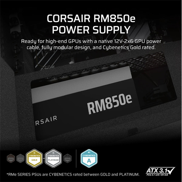 CORSAIR Tápegység Moduláris, RM850e, 850W, 12cm, ATX 3.1, PCIe 5.1, BOX, Cybenetics Gold